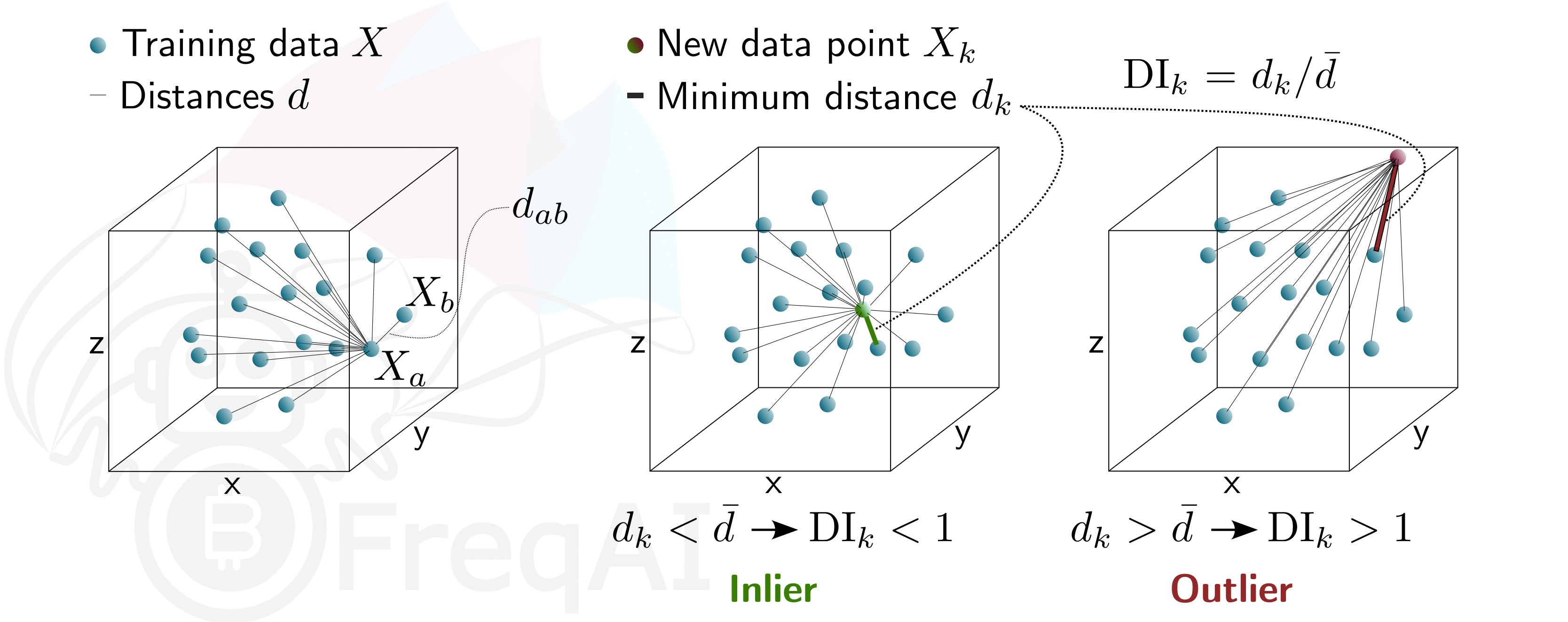 \(\overline{d}\) quantifies the spread of the training data, which is compared to the distance between a new prediction feature vectors, \(X_k\) and all the training data: