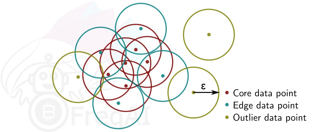 FreqAI uses sklearn.cluster.DBSCAN (details are available on scikit-learn's webpage here (external website)) with min_samples (\(N\)) taken as ¼ of the no. of time points (candles) in the feature set. eps (\(\varepsilon\)) is computed automatically as the elbow point in the k-distance graph computed from the nearest neighbors in the pairwise distances of all data points in the feature set.